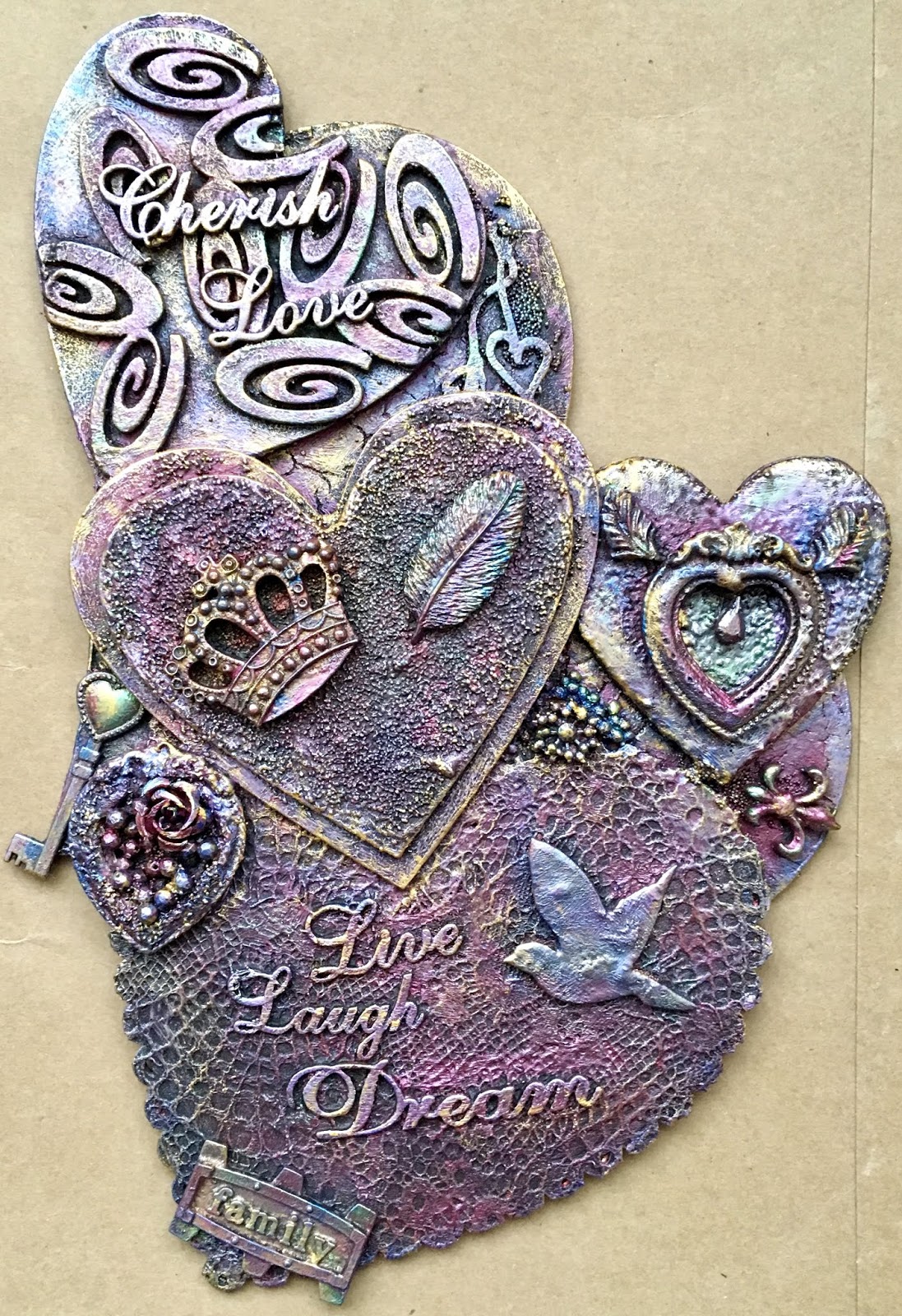 When it was completely dry, I applied a 2 part crackle liquid by Cosmic Shimmer, while drying I heat embossed the little MDF heart using Persian Indigo embossing powder by WOW! this is lovely, with it's beautiful rich colour & gentle shimmer. When cool I stamped over it using a random word stamp & edged with black Archival Ink by Ranger. Sorry, but I don't know what brand the stamp is or what the words read, it is to small for my poor old eyes to make it out lol..! After adhering the heart in place, I went back to work on the top part again. I felt that even though the crackle paste had worked nicely, the piece still lacked something? So after a think over a cup of tea, I remembered that I had some sticky back gems, you know the cheap ones that come on a line of glue? I never use them normally, but they were the perfect finishing touch. So, I ran a line of glue following the curve of the paint, to make sure that they stayed out & then with a sponge I dabbed some of the same paint on them to blend them in ..... Voila, I now had an ACT that I was happy to share .....